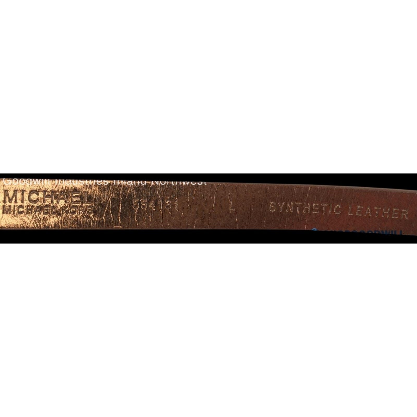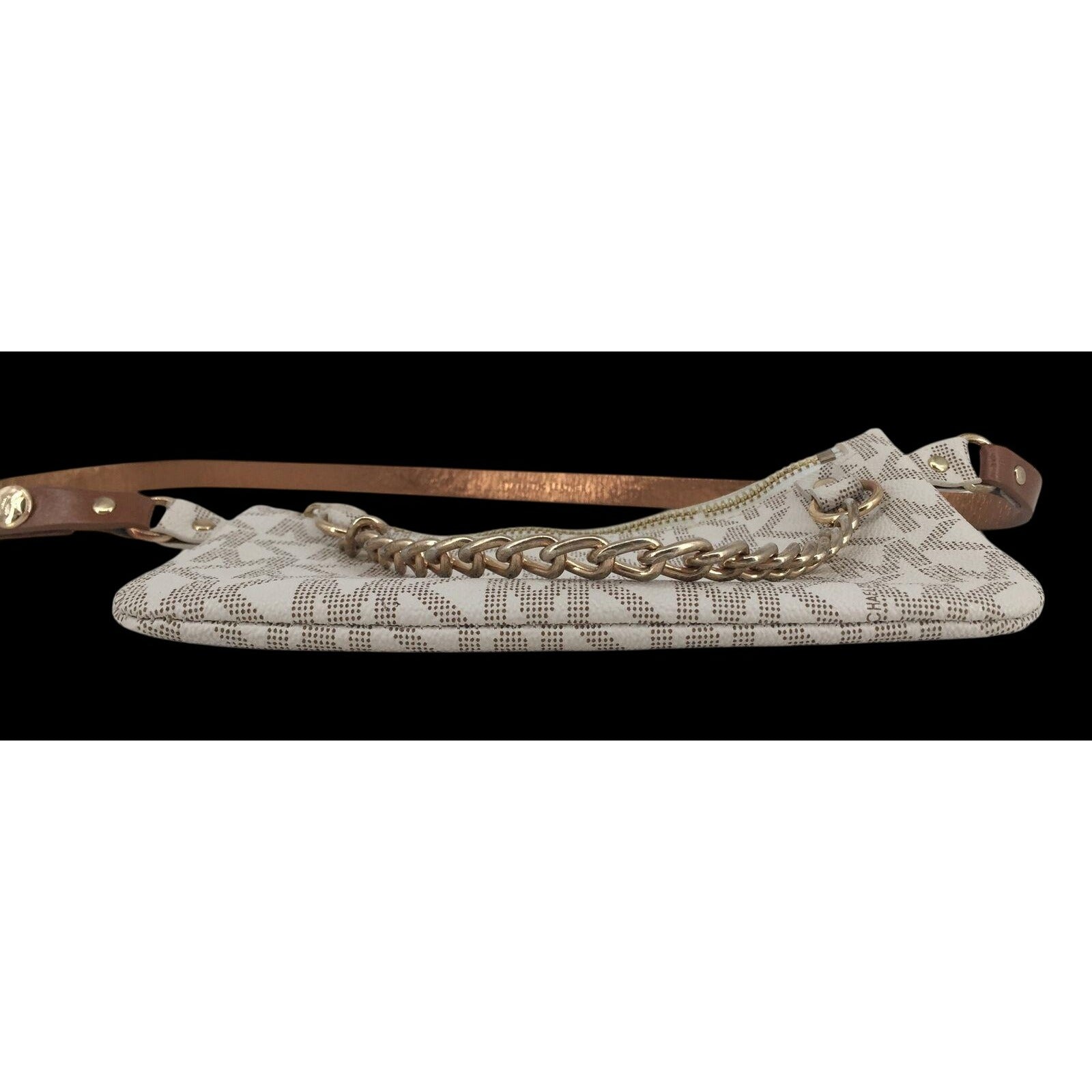 Elegant Michael Kors monogram bag features a gold chain and adjustable strap. The sleek faux leather belt bag design is perfect for on-the-go style and convenience.