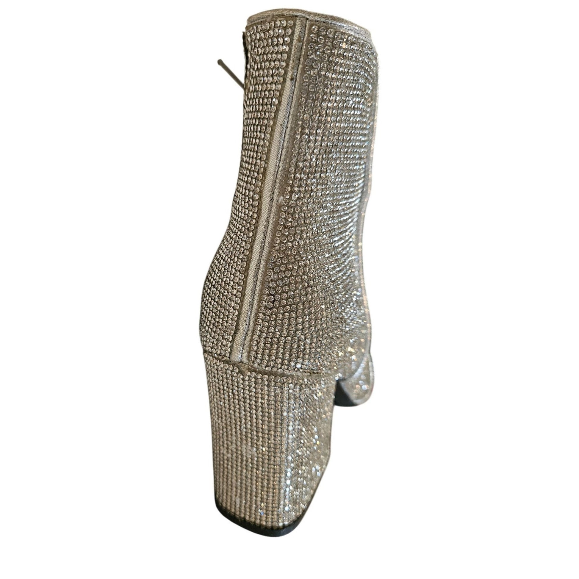 Rhinestone-Embellished Silver Pointed-Toe Ankle Boots With Block Heel & Side Zipper Closure size 6